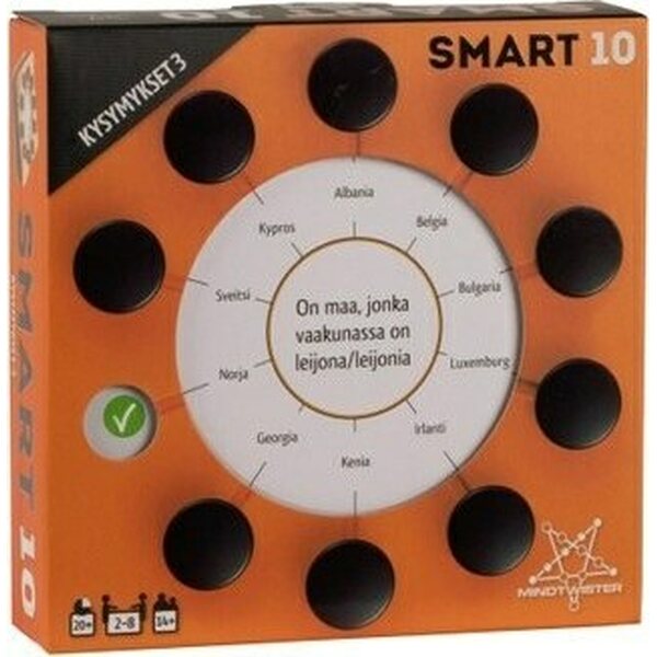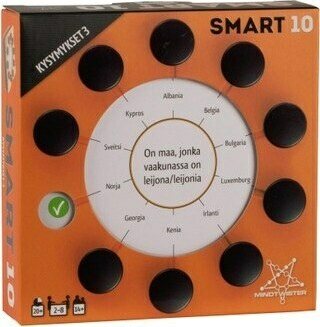 Smart 10 Kysymykset 3 sisältää 100 uutta kaksipuolista kysymyskorttia, jotka sopivat yhteen Smart10 peliin. Tarvitsee osakseen alkuperäisen Smart10 tai Smart10 Junior pelin. Pelaajia: 2-8 Aika: 20min Ikäsuositus: 14 +