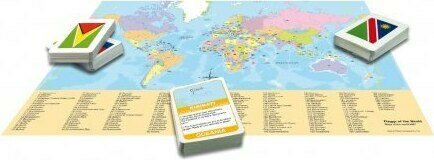 Tuotteen kuvausValitse yksi jonkun toisen pelaajan edessä olevista korteista ja veikkaa, mille maalle se kuuluu. Jos arvaat oikein, saat kortin itsellesi. Jos vastauksesi onkin väärin, voit vastata kyseiseen maahan liittyvään kysymykseen. Eniten pistekortteja kerännyt pelaaja voittaa!