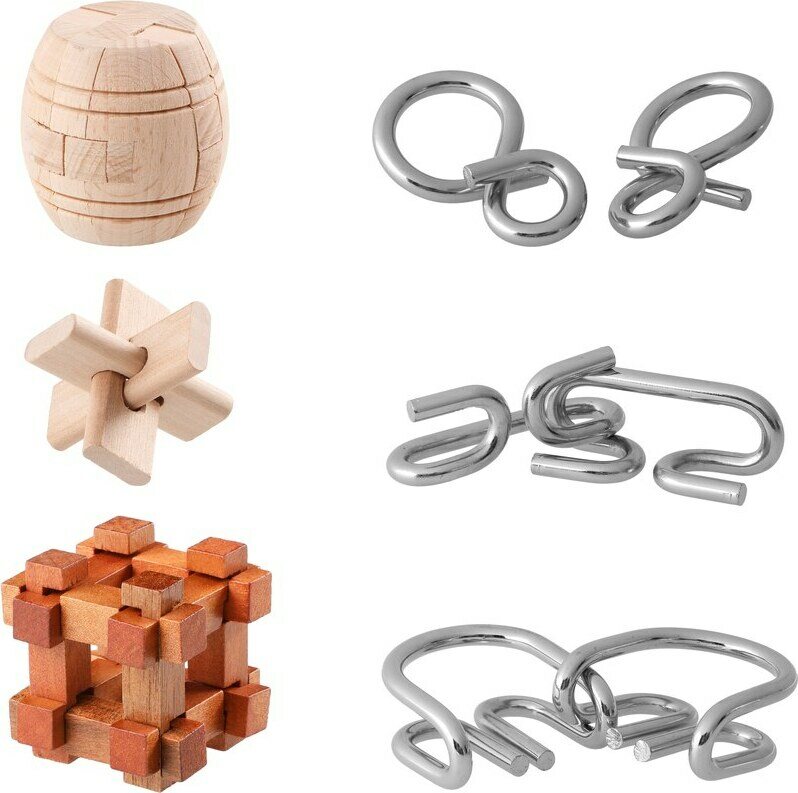 Pulmapeleissä on vaihtelevia vaikeustasoja, joten kaikille löytyy sopiva. Tämä pulmapelipakkaus on välttämätön kaikille, jotka nauttivat loogisen ajatteluprosessin rajojen testaamisesta. Sisältää kuusi suosittua pulmapeliä (3 puista + 3 metallista) ja ohjeet. Mukana ohjeet ja lisäksi bonuskysymyksiä vain englanniksi. Ikäsuositus 6+.