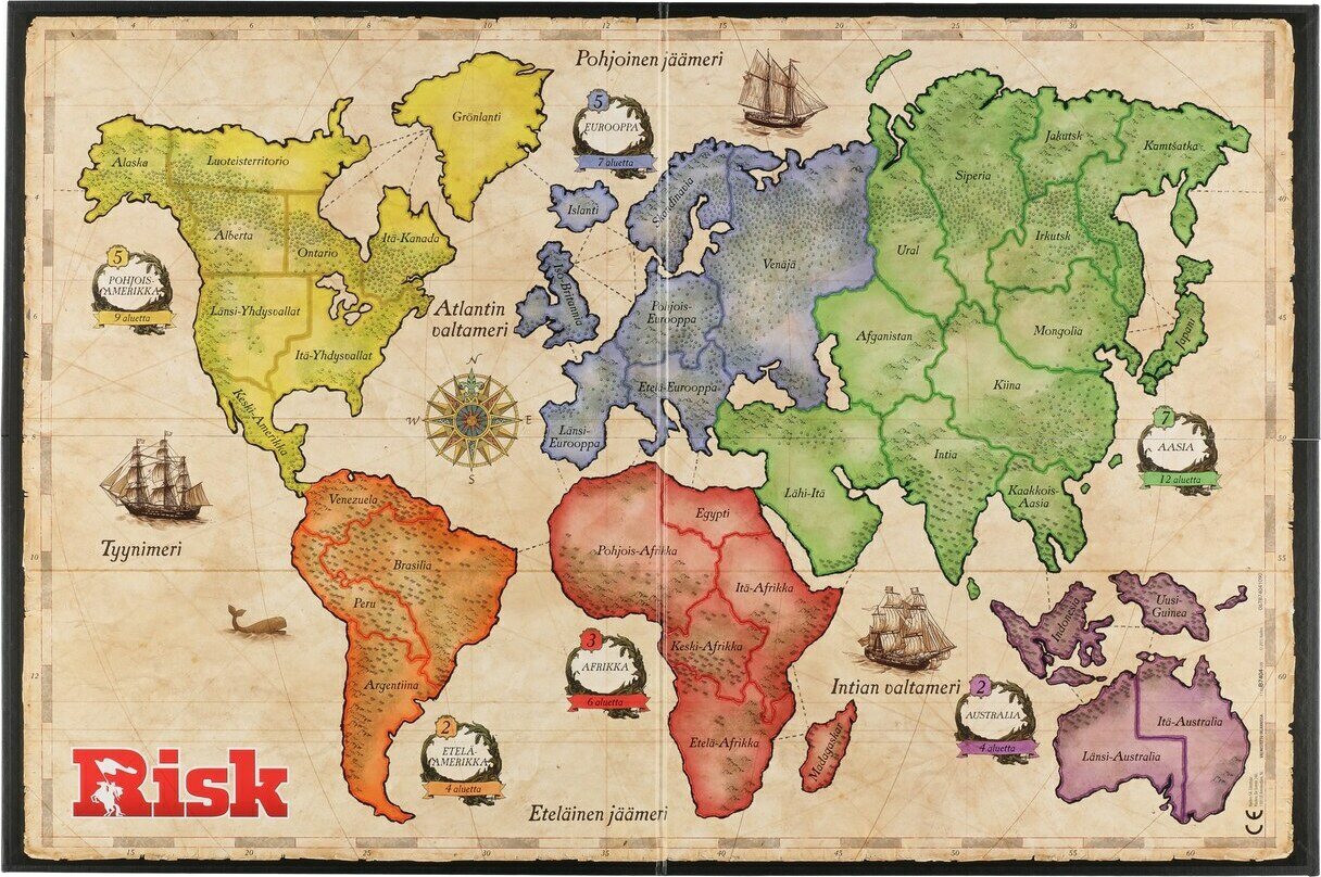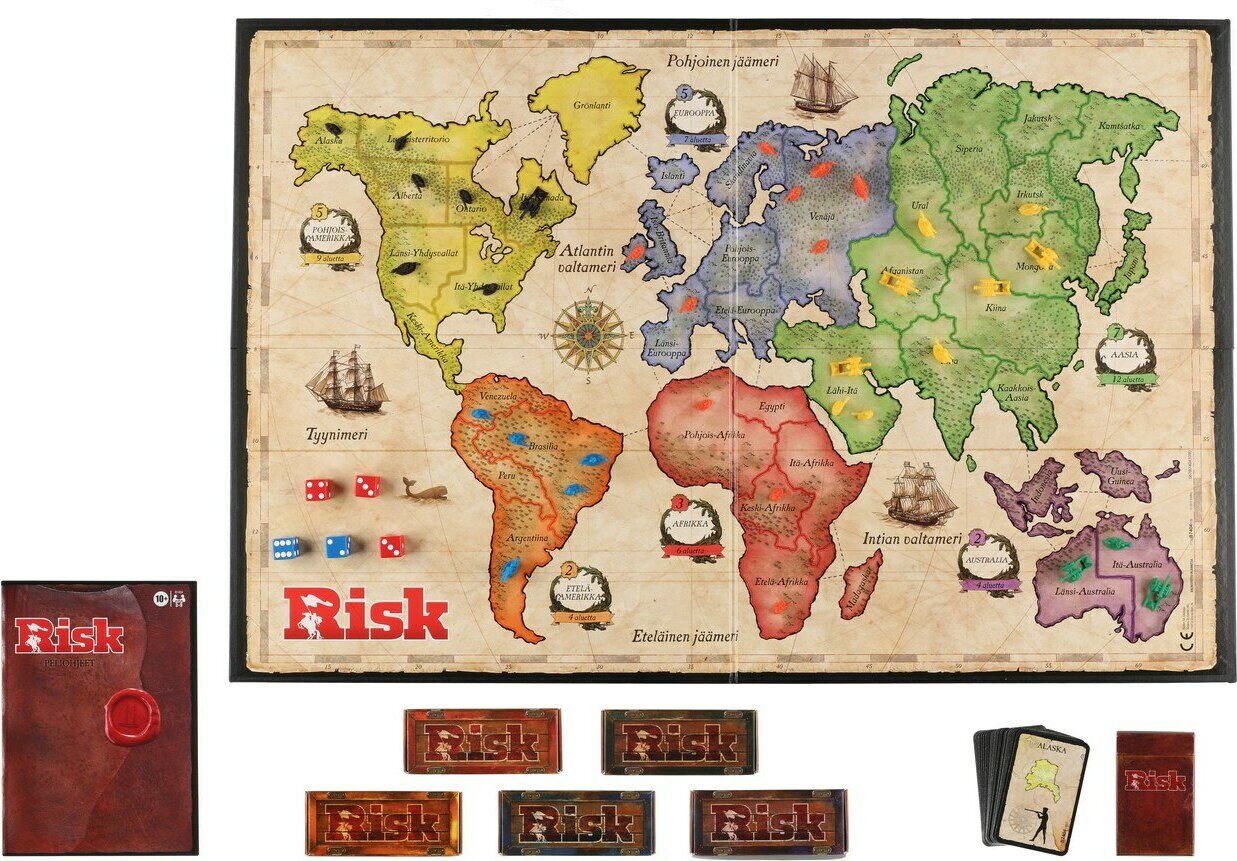 Tuotteen kuvausRisk lautapeli on klassinen strategiapeli. Risk lautapelissä pelaajat rakentavat armeijaansa, osallistuvat taisteluun ja valloittavat vihollisten alueita. Lautapeliä pelataan maailmankarttaa kuvaavalla pelilaudalla, joka on jaettu kuuteen maanosaan, jotka muodostavat pienempiä alueita. Pelin tavoitteena on ohjata armeijaa ja valloittaa alueita vastustajilta sekä suorittaa Risk pelin alussa saatu tehtävä. Peli sopii pelattavaksi perheen kesken sekä mukaan kavereiden peli-iltoihin.
