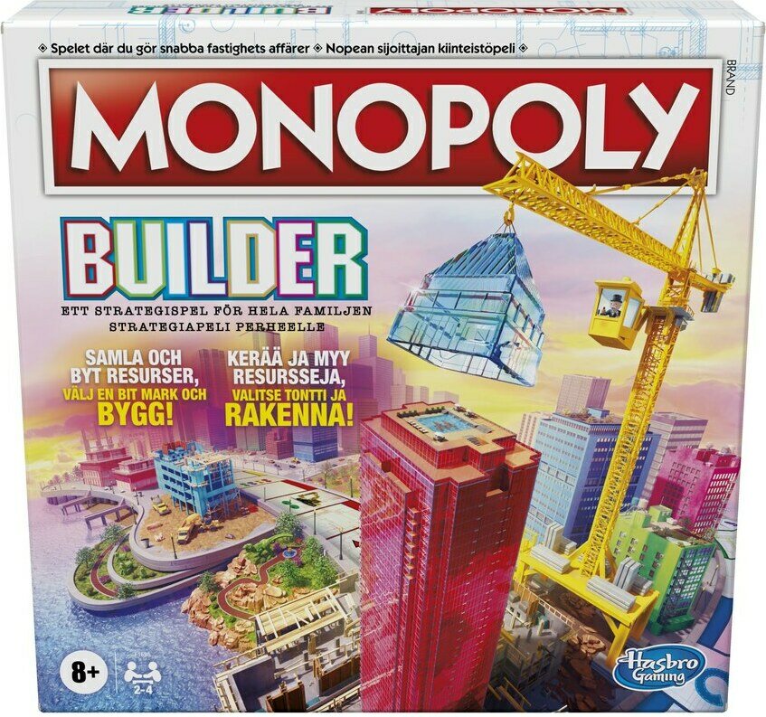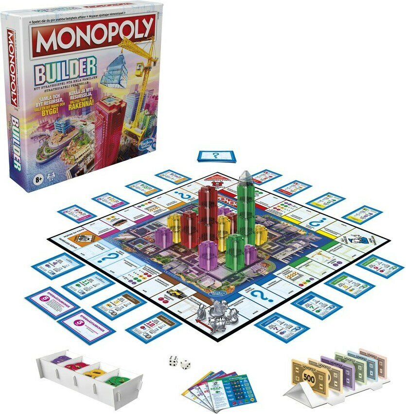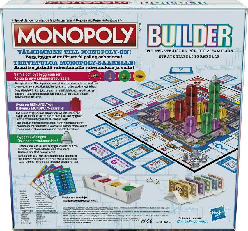 Tuotteen kuvausMonopoli uudella strategisella twistillä! Nyt et osta enää vain omaisuutta, vaan myös rakennat sitä Monopoly Islandille! Tässä Monopoliversiossa pelaajat haalivat omaisuutta ja pinoavat kiinteistönsä fyysisesti. Resurssien kerääminen ja kaupankäynti ovat avain menestykseen ja Monopoly Island herää henkiin keskellä pelilautaa! Kilpailuhenki ja sosiaalinen vuorovaikutus vahvistuvat, kun pelaajat rakentavat yhä korkeampia torneja! Pelaaja, joka ensimmäisenä rakentaa torniinsa kultaisen kattohuoneiston, on voittaja! Ikäsuositus 8+.