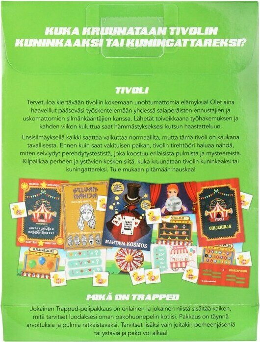 Tuotteen kuvausTervetuloa kiertävään tivoliin kokemaan unohtumattomia elämyksiä! Olet aina haaveillut pääseväsi työskentelemään yhdessä salaperäisten ennustajien ja uskomattomien silmänkääntäjien kanssa. Lähetät toiveikkaana työhakemuksen ja kahden viikon kuluttua saat hämmästykseksesi kutsun haastatteluun. Ensisilmäyksellä kaikki saattaa vaikuttaa normaalilta, mutta tämä tivoli on kaukana tavallisesta. Ennen kuin saat vakituisen paikan, tivolin tirehtööri haluaa nähdä, miten selviydyt perehdytystestistä, joka koostuu erilaisista pulmista ja mysteereistä. Kilpailkaa perheen ja ystävien kesken siitä, kuka kruunataan tivolin kuninkaaksi tai kuningattareksi. Tule mukaan pitämään hauskaa!