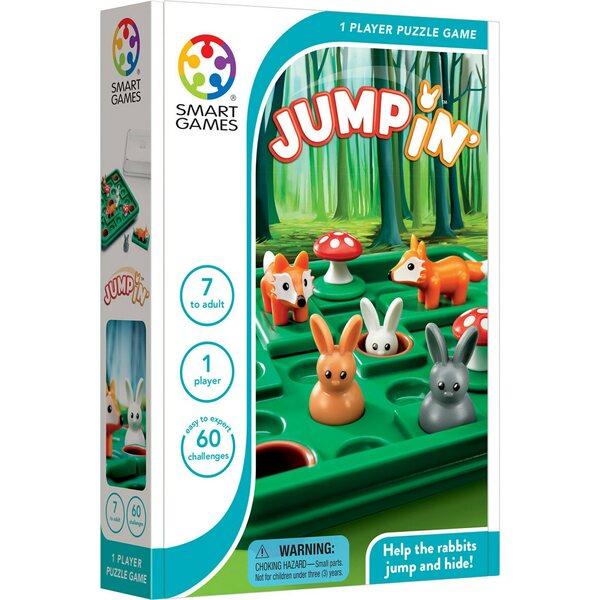 SmartGames Jump In -pelin tavoitteena on saada kaikki kanit piiloon ja turvaan koloihin. Kanit liikkuvat vain hyppäämällä esteiden yli. Esteitä ovat sienet, ketut ja toiset kanit tai näiden muodostamat yhdistelmät. Sieniä et voi siirtää, mutta kettuja voit liikuttaa tarpeen mukaan liu'uttamalla eteen- tai taaksepäin. Haasteessa näet oikeaan ratkaisuun tarvittavien siirtojen vähimmäismäärän. Voit onnistua haasteen ratkaisemisessa myös käyttämällä muita, pitempiä reittejä. Haastavin tehtävä vaatii yli 80 siirtoa, joten tämä peli tarjoaa sopivaa aivojumppaa pitkäksi aikaa - myös aikuisille!