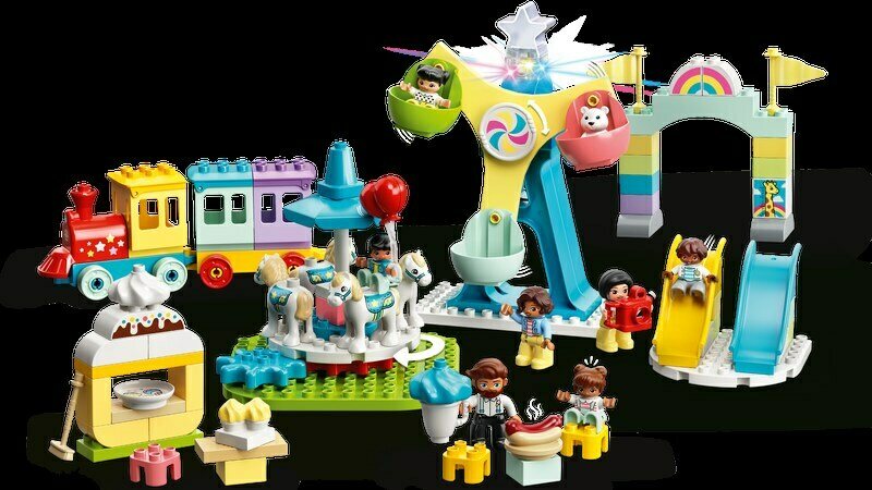Sisältää 7 DUPLO® hahmoa – 2 naista, 1 miehen ja 4 lasta – 2 liukumäkeä, mekaanisen karusellin, pyörivän maailmanpyörän, jossa on 3 värikästä koria, työnnettävän junan ja paljon hauskoja tarvikkeita.