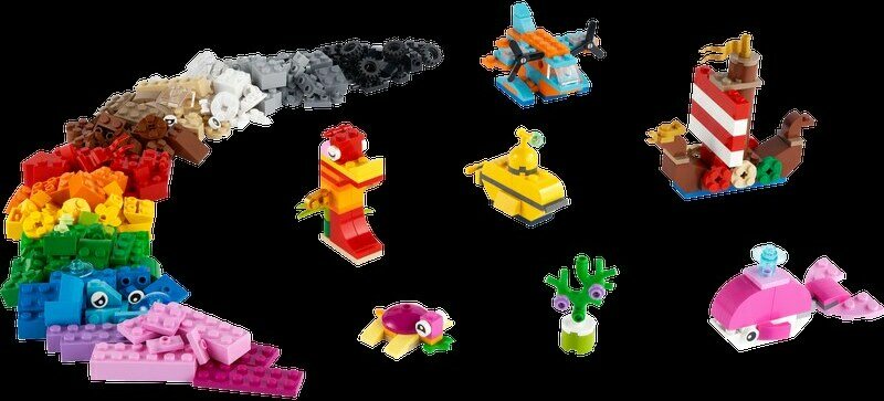 Mitä pakkaus sisältää? – Mukana on kaikki, mitä lapset tarvitsevat viikinkilaivan, keltaisen sukellusveneen, vedenalaisen dronen, merihevosen, valaan ja kilpikonnan rakenteluun, mukana on myös 2 lisäpussillista LEGO® palikoita luoviin leikkeihin
