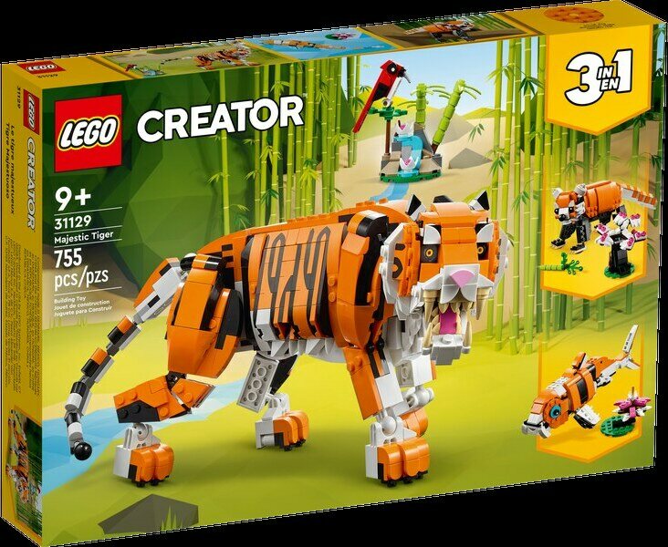3in1-setissä 3 eläinmallia – LEGO® fanit voivat uppoutua loputtomiin seikkailuihin Majesteettinen tiikeri (31129) setin parissa, jonka osista voi rakentaa tiikerin, kultapandan tai koikarpin