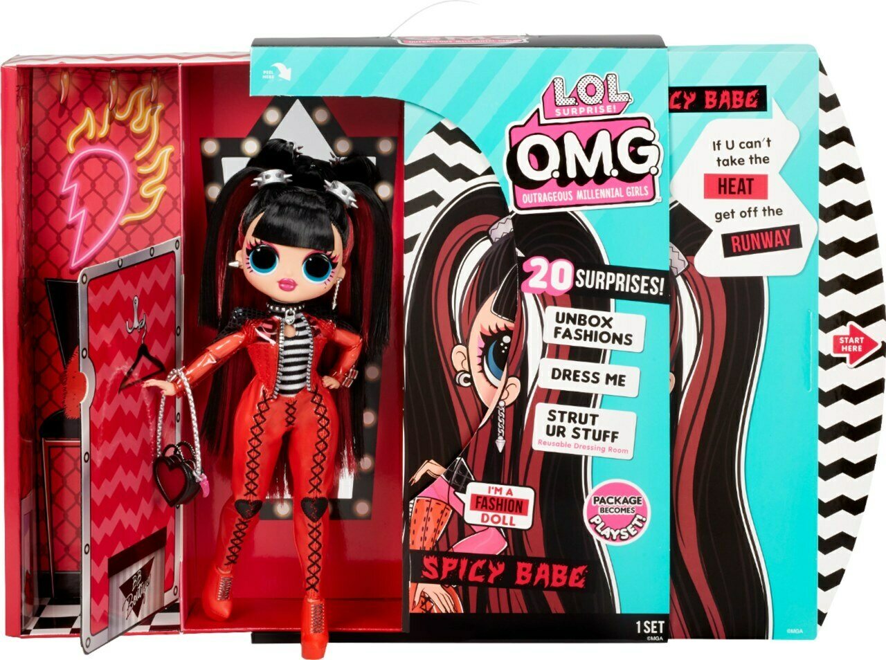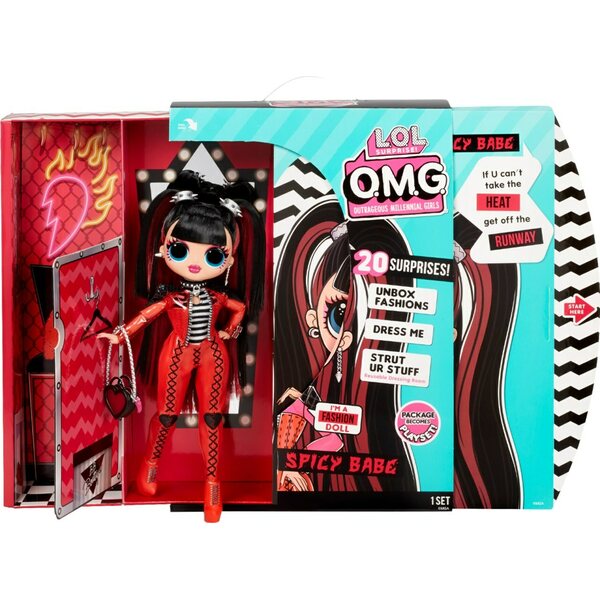LOL Surprise Spice Baby nukke, jonka mukana tulee vaatteita, kengät, hattulaatikko, hiusharja, vaatepussi, tarra, henkari sekä nukke pidike.