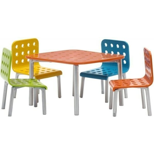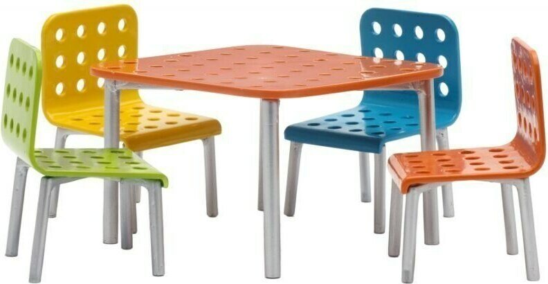 Lundby värikkäät terassikalusteet nukkekotiin. Näillä sisustat hyvin oman Lyndby nukkekotisi! Pöydän väri punainen, tuolit punainen,keltainen,vihreä ja sininen.