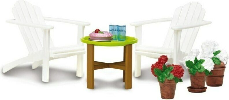 Lundbyn maailmassa voi olla aina kesä! Tällä hienolla kalustesarjalla voit nauttia kesäisistä kahvihetkistä puutarhassa. Pihatuolien lisäksi setti sisältää tyylikkään pyöreän pöydän, kaksi juomalasia ja maukkaan täytekakun. Setissä on myös kaksi kukkaruukkua pihan koristamiseksi.