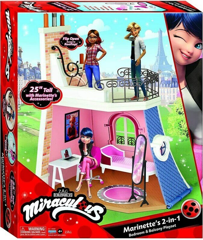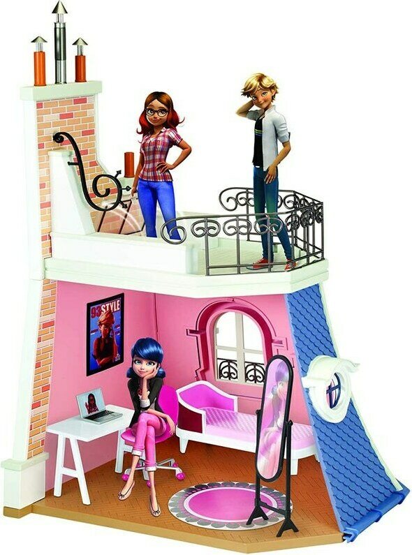 Miraculous makuuhuone ja parveke setti. Setin mukana tulee Marinetten suunnittelupöytä, toimistotuoli, kannettava tietokone, peili, lepotuoli ja pyöreä matto.