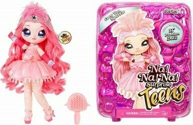 NA NA NA Surprise Teens Coco Von Sparkle muotinukke. Vaaleanpunaiset pitkät hiukset ja vaaleanpunainen mekko.