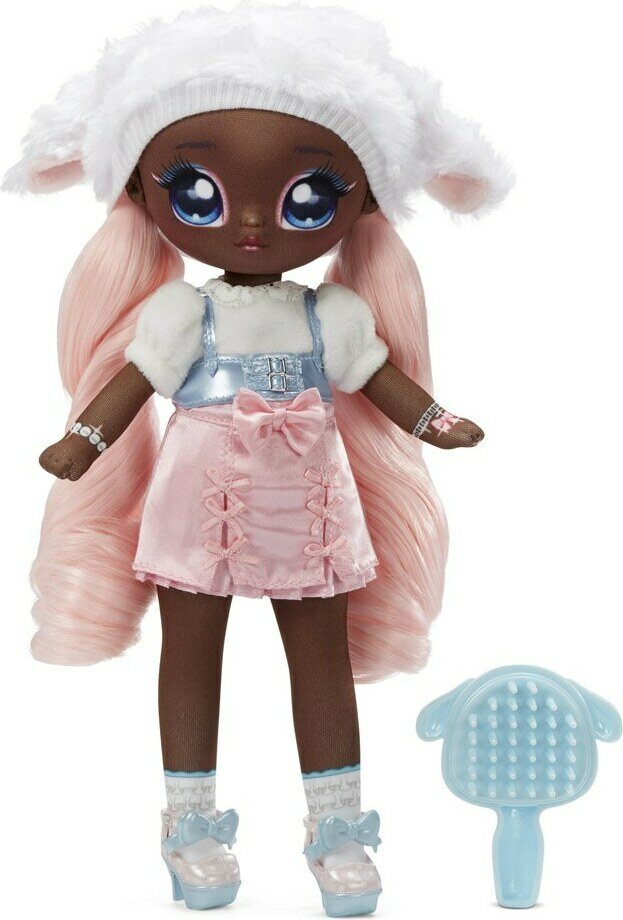 NA!NA!NA! SURPRISE LILA LAMB muotinukke vaaleanpunaisilla hiuksilla. Paketissa tulee vaatteet ja harja nukelle. Ikäsuositus 3+ vuotta.