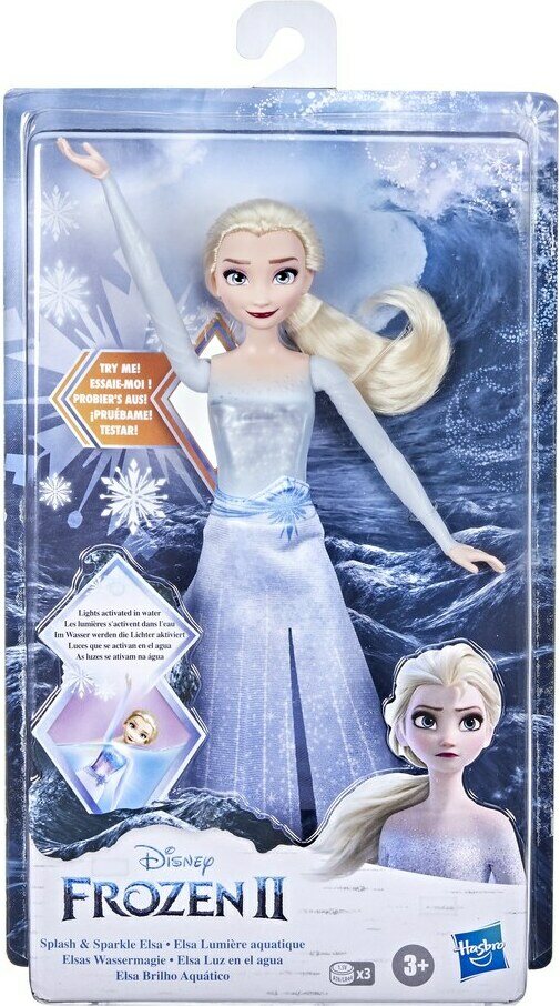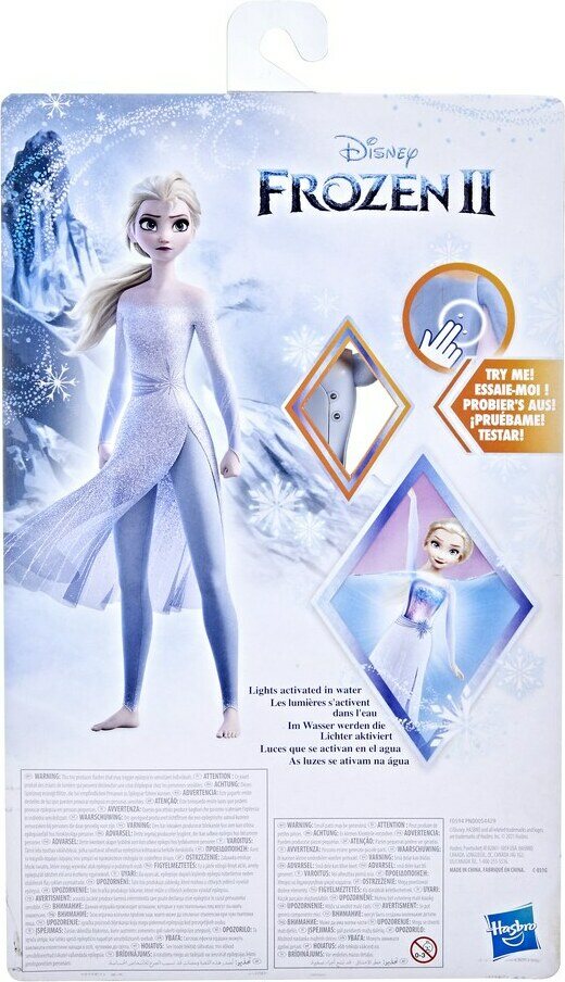 28 cm Elsa-nukke Frozen 2 –elokuvan innoittamassa mekossa. Valettuun yläosaan syttyy valot, kun laitat nuken veteen. Vesi paljastaa mekosta upeat timantin muotoiset kuviot. 5 nivelpistettä. Aidonoloiset hiukset. Ikäsusoitus 3+.