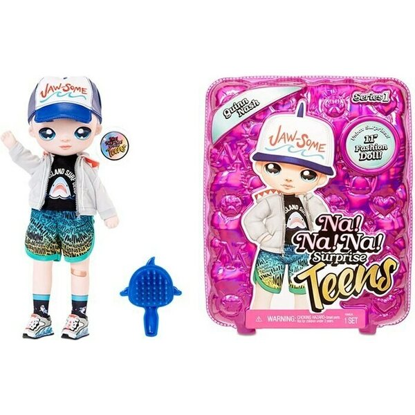 Na! Na! Na! Surprise Teens Quinn Nash poikanukke. Nukella päällään siniset shortsit, T-paita, huppari, kengät, sukat ja lippis. Mukana harja nukelle. Ikäsuositus 7+.