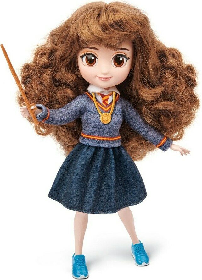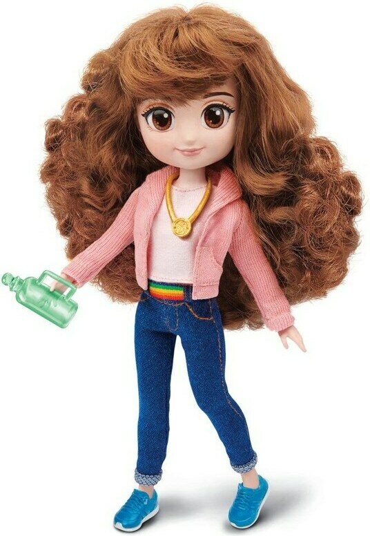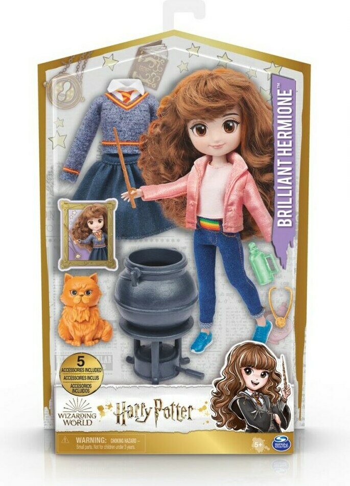 Brilliant Hermione nukke, jolla käännettävät nivelet. Nuken pituus on n. 19 cm. Pakkauksen mukana tulee nukke, 2 asusettiä, kengät, Koukkujalka -kissa, taikapata, juomapullo ja taikasauva. 3+ vuotiaille