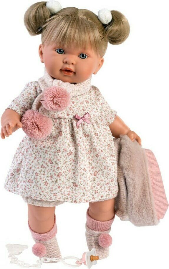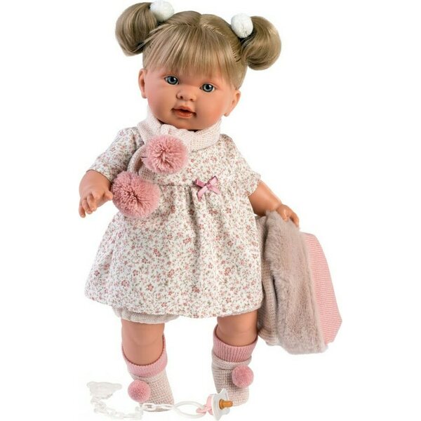 Llorens Alexandra on pehmeävartaloinen nukke vaaleilla hiuksilla. Llorens nuket on valmistettu käsin Espanjassa. Nuken mukana tulee vaaleanpunainen mekko, villasukat, kaulaliina ja takki sekä tutti.
