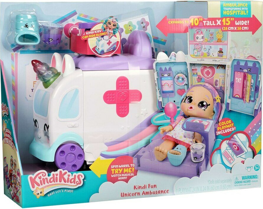 Leikkisetiksi avautuvasta ambulanssista löydät sängyn, hoitoalueen, hoitovälineet ja Shopkin-ystäviä. Voit viedä Kindi Kids -nukkesi röntgeniin, tarkistaa sykeken ja seuraa verenpainetta mittarista. Mukana myös leikkimatto. Ikäsuositus 3+