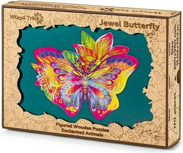 WOODTRICK JEWEL BUTTERFLY Jalokivi perhonen, puinen palapeli, jossa palat poikkeavat perinteisestä muodosta: löydät mm eläinten muotoisa paloja. Osien määrä 170 kpl. Palapelin koko 28x36 cm. Materiaali koivuvaneri. Ikäsuositus 8+ vuotta.