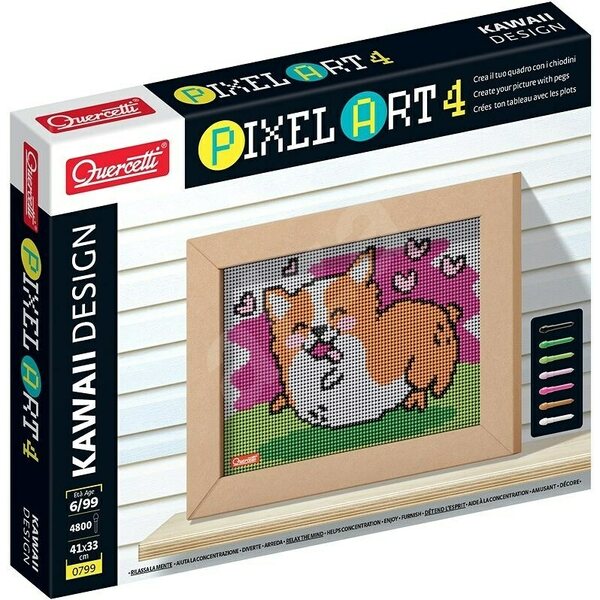 Corgi mosaiikin tekosetti. Paketti sisältää 4800 eriväristä tappia, alusta, kehykset ja muovinen painalluskynä. Ikäsuositus: 6+ vuotta Koko: 41×33 cm.