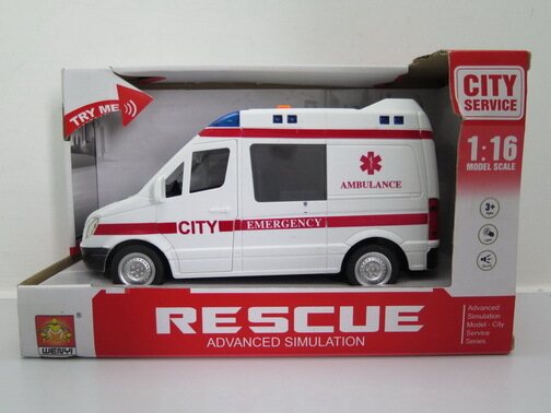 Ambulanssi valoilla ja äänillä. Autossa avautuvet ovet sivuilla ja takana. Kulkee vauhtipyörämekanismilla. Auton pituus 22 cm ja mittasuhde 1:16. Paristot 3 x AG13 / LR44 (sisältyy). Tuotteen mittatiedot: 27 x 16 x 11 cm – 0,453 kg.
