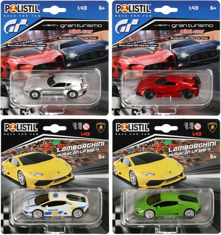 Lajitelmassa useita erilaisia vara-autoja, jotka ovat yhteensopivia Polistil autoratojen 324153, 324154, 324155 ja 324156 kanssa. Hinta sisältää yhden auton. Ikäsuositus 6+.