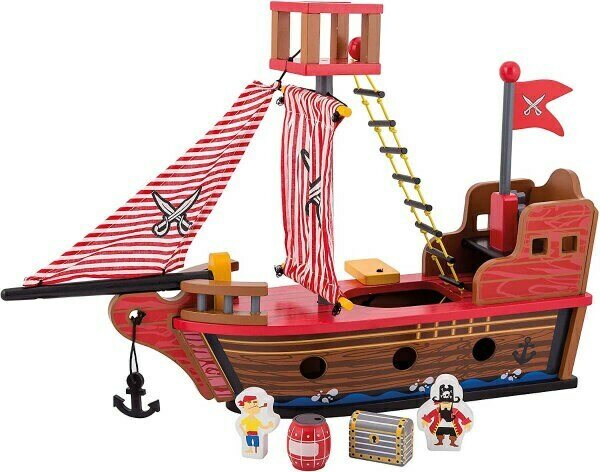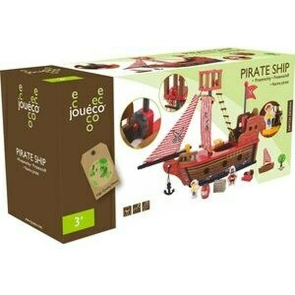 Puinen, laadukkaista materiaaleista rakennettu Joueco Merirosvolaiva, jossa mukana kapteeni ja perämies hahmot, pieni pelastusvene, kanuuna, aarrearkku ja tynnyri. Materiaali: puu. Pakkaus n. 44 x 20 x 14 cm Ikäsuositus: 3+ vuotta