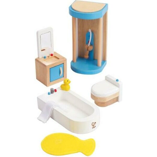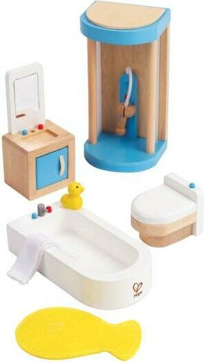 Kauniit nukkekodin puiset kalusteet. Allaskaapin ovi sekä wc-pöntön kansi aukeavat. Suihkukaapin korkeus 14 cm. Paketin koko: 20x10x26 cm. Ikäsuositus: 3+.