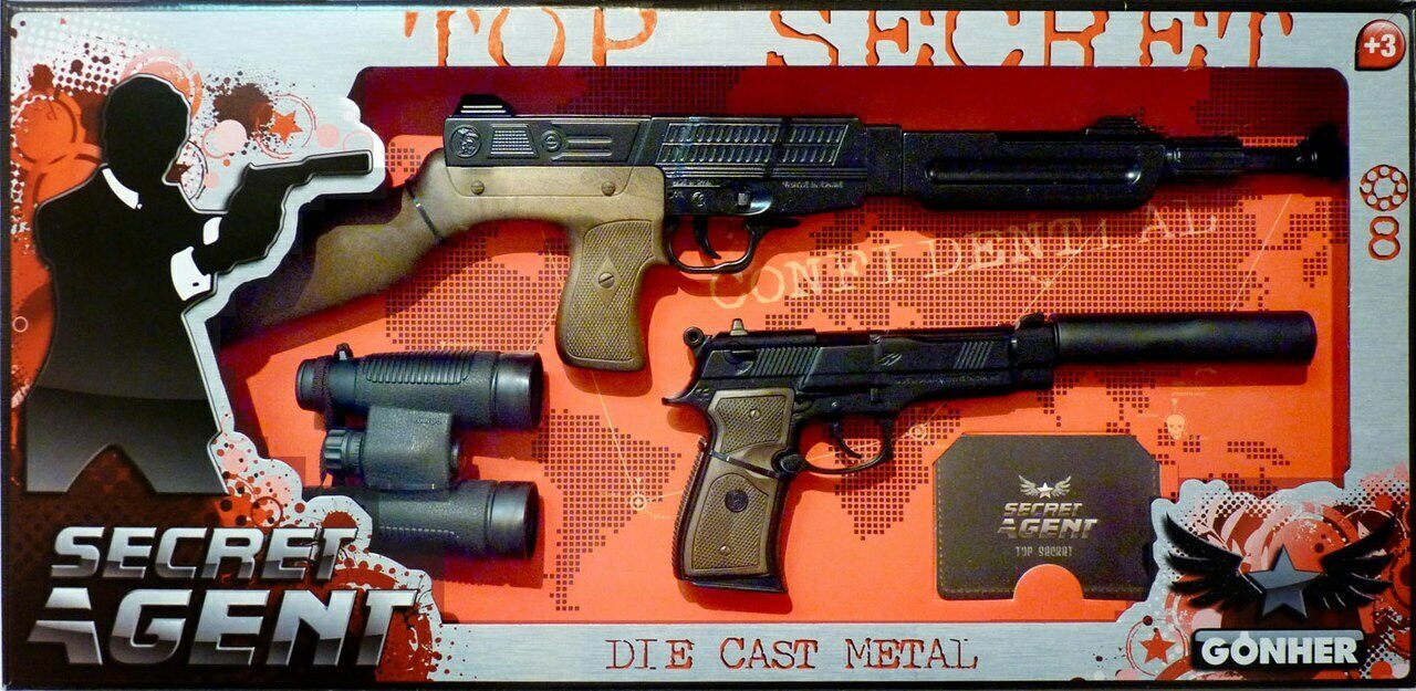 Gonher Salainen agentti leikkisetti. Pakkaus sisältää kaksi pyssyä, kiikarit ja salaisen agentin korttikotelon! Ammukset eivät kuulun pakettiin. Ikäsuositus 3+.