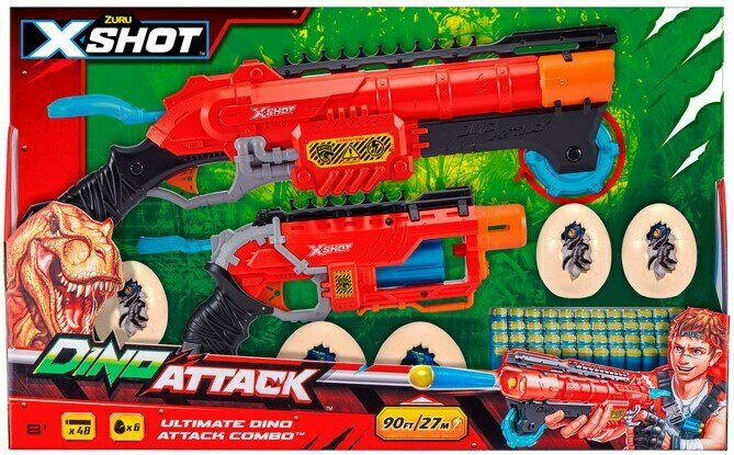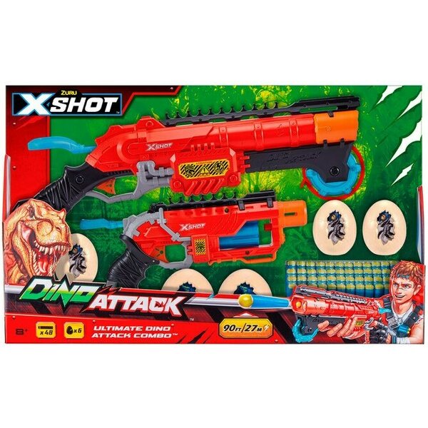 Hurjat dinosaurukset ovat vallanneet maan. Ota käteesi vaahtomuoviammuksia ampuva ase, tähtää ja estä dinopopulaation kasvu. Tuplapakkaus sisältää D-Hunter ja D-Eliminator aseet, kuusi dinomunaa ja 48 ammusta. Ikäsuositus yli 8-vuotiaille.