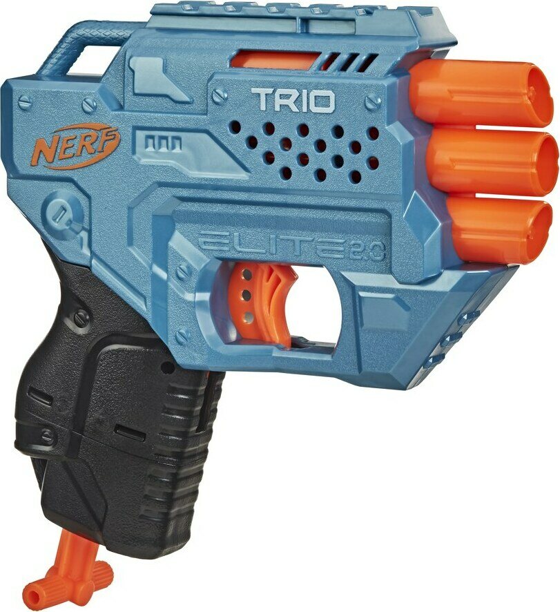 Nerf Elite 2.0 Trio TD-3 -blasterissa on yksi taktinen kisko, jotta voit muokata blasterisi jokaiseen Nerf-peliin sopivaksi. Blasterissa on kolmen nuolen pystysuuntainen pidike, joten voit laukaista kolme nuolta peräkkäin. Sisältää kuusi virallista Nerf-nuolta – 3 blasteriin ja 3 varalle latauksia varten. Nuolet lentävät jopa 27 metriä. Blasterin pituus n. 15 cm.