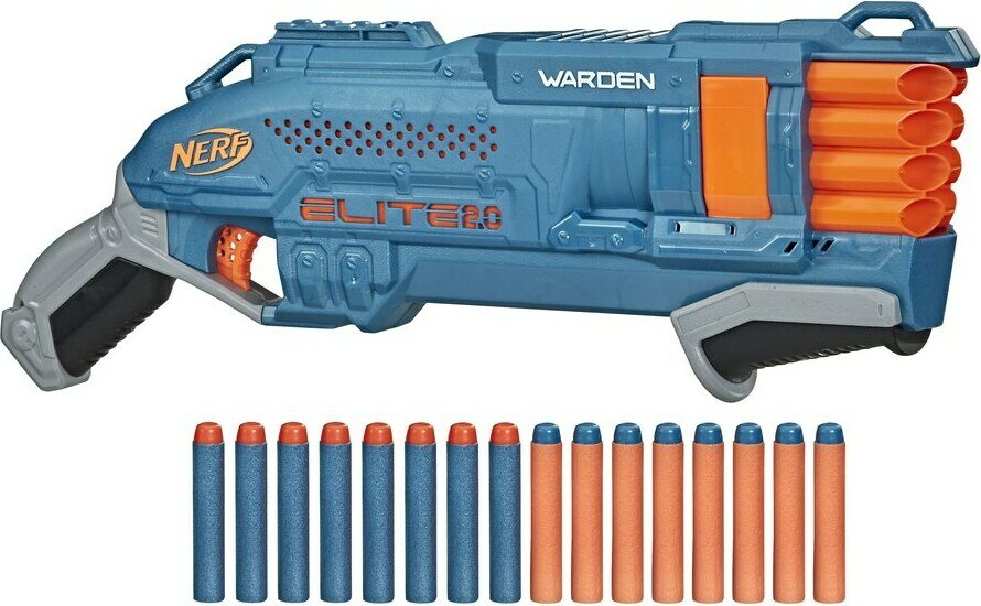 Nerf Elite 2.0 Warden DB-8 -blaster on pumpputoiminen ja se ampuu kaksi nuolta kerrallaan. Siinä on 8 nuolen pidike. Taktisen kiskon avulla voit muokata blasteriasi jokaiseen Nerf-peliin sopivaksi. Sisältää 16 Nerf-nuolta - 8 blasteriin ja 8 varalle latauksia varten. Nuolet lentävät jopa 26 metriä. Silmäsuojia suositellaan (ei sisälly). Ei vaadi paristoja. Blasterin pituus n. 45 cm.