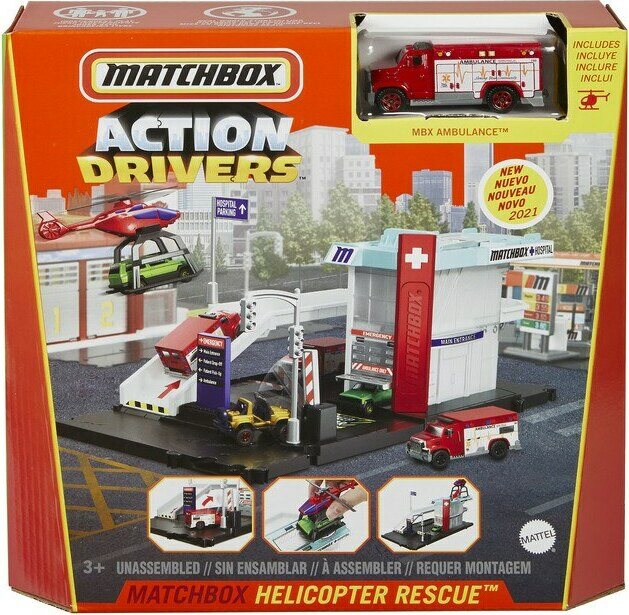 Valitse suosikkisi Matchbox-leikkiseteistä ja aja kohti vauhdikkaita seikkailuja. Setit voi yhdistää toisiinsa tai jopa Hot Wheels City -leikkisetteihin. Pakkauksessa mukana yksi pikkuauto. Useita erilaisia. 4+.