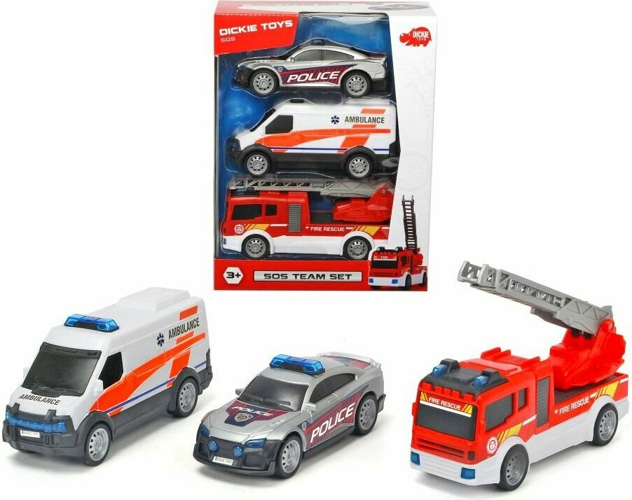 Dickie Toys Sos Team Set, jossa paloauto, ambulanssi ja poliisiauto. Ikäsuositus 3+ vuotta.
