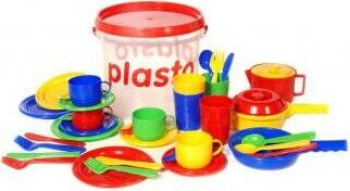 Plasto astiasto sisältää sekä kahvi että ruokailuastiat, kannun ja paistokasarin. Yhteensä 39 osaa.