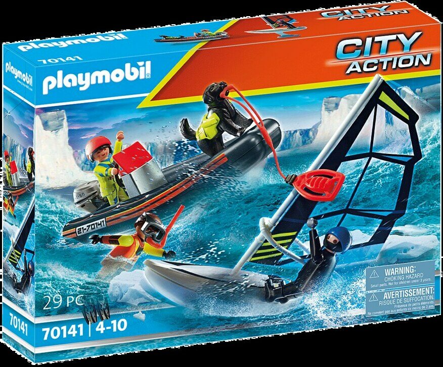 Kokemuksestaan huolimatta polaaripurjehtija aliarvioi vahvan virran. Aalto heitti hänet ulos veneestä, ja hän loukkasi itsensä. Nyt hän kelluu avuttomana vedessä. Mutta pelastusryhmä on jo matkalla, ja heillä on mukanaan erityinen apulainen: heidän pelastuskoiransa. Apulaiset ajavat kumiveneellä mahdollisimman lähelle haaksirikkoutunutta. Sitten koira hyppää veteen ja tuo loukkaantuneelle pelastuspoijun. Purjehtija tarttuu nopeasti pelastusliivin poijuun ja kahvaan, ja koira vetää hänet veneelle. Tästä taidokkaasta pelastuksesta nelijalkainen pelastaja onkin ansainnut kunnon palkinnon. Leikkisarja sisältää kolme PLAYMOBIL-hahmoa, koiran, kumiveneen, polaaripurjehtijan, pelastuspoijun ja monia muita lisätarvikkeita.