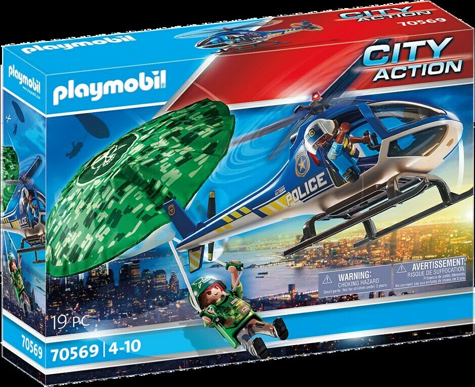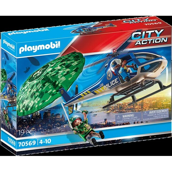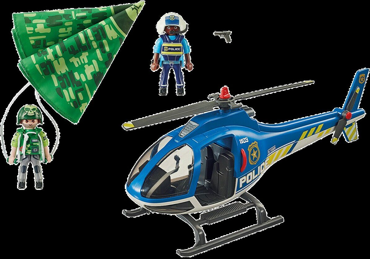 Tämä poliisioperaatio on korkealla. Roisto haluaa paeta laskuvarjolla. Mutta siinä hän teki laskelmansa ilman nokkelaa PLAYMOBIL-poliisia helikopterissaan. Samalla kun varas liukuu hitaasti maahan, poliisi pitää häntä silmällä helikopterin ohjaamosta. Laskeutuessaan häntä jo odotetaan. Seuraava matka on vankilaan.Leikkisetti sisältää kaksi PLAYMOBIL-hahmoa, poliisin ja rikollisen, poliisihelikopterin, laskuvarjon ja monia muita lisävarusteita jännittäviin takaa-ajoihin ilmassa. Laskuvarjo voidaan heittää ilmaan hahmon kanssa ja se kelluu sitten maahan.