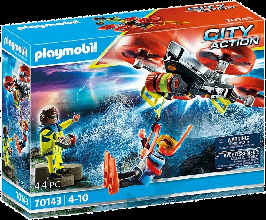 Droneja käytetään nykyään myös meripelastuksessa. Liikkuvat lennokit pääsevät helposti myös vaikeasti tavoitettaville alueille. Sukeltaja on pulassa. Pelastaja valmistelee dronen välittömästi ja ohjaa sen loukkaantuneen luo. Pelastaja ohjaa lennokin sukeltajan yläpuolelle, avaa vinssin ja laskee pelastusköyden. Kun nainen on pukenut pelastusliivin, drone nousee ylös ja lennättää naisen turvallisesti takaisin rantaan. Hieno suoritus! Leikkisarja sisältää kaksi PLAYMOBIL-hahmoa, pelastusdronen, vinssin ja pelastusköyden, räpylät, snorkkelin ja muita lisävarusteita.
