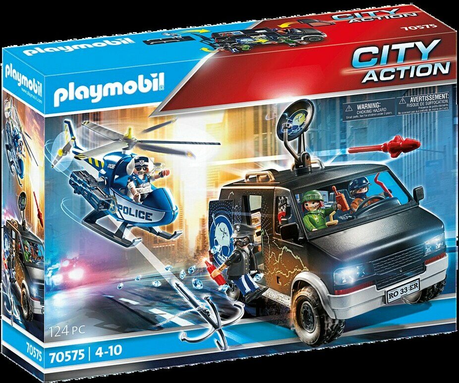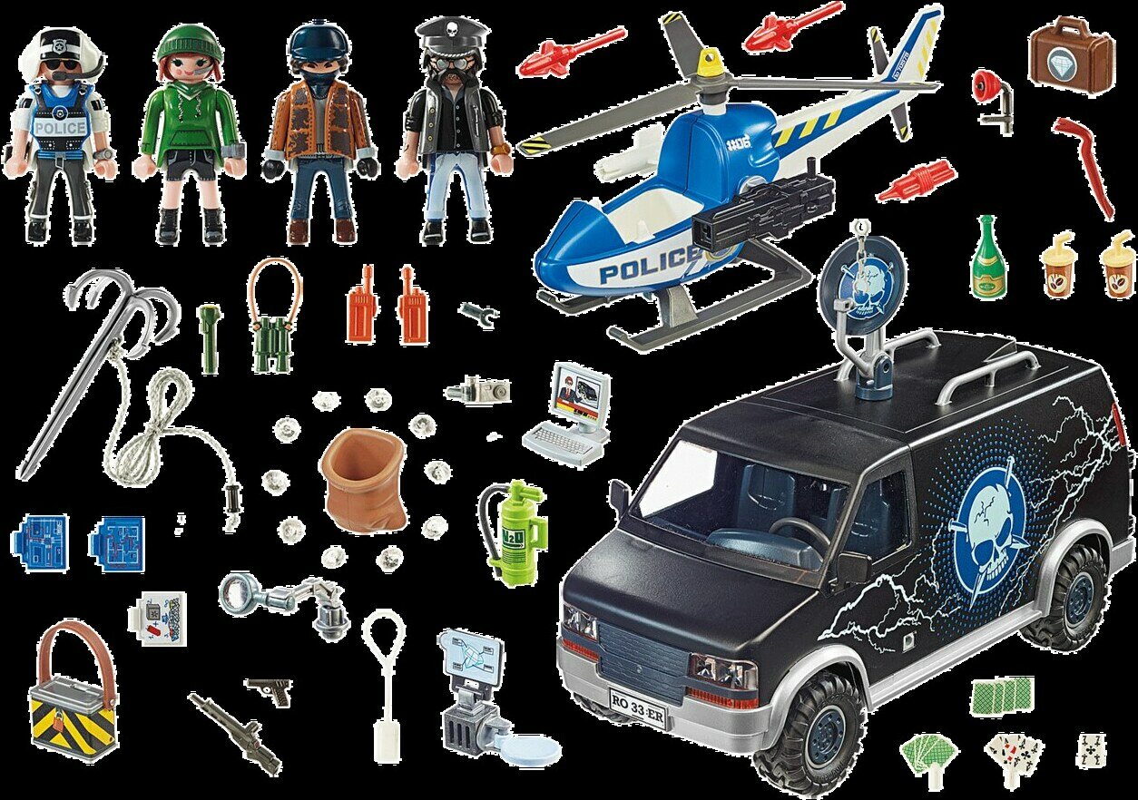 Gangsteritrio on suunnitellut minuutilleen tapahtuvaa timanttivarkautta jo viikkojen ajan huolellisesti. Heidän musta pääkallokuvioinen pakettiauto on liikkuva murtohälytyskeskus, jossa on tietokone ja laboratorio. Hyllyn seinällä on tilaa sorkkaraudoille ja lasileikkureille. Jengipomo on tutkinut museon rakennuspiirustukset erittäin huolellisesti ja sisäänpääsy on sujunut täydellisesti. Nyt timanttien puhtaus tarkistetaan suurennuslasin alla. Ne ovat parasta laatua olevia kiviä. Kun murtovarkaat paahtavat onnistuneen vallankaappauksensa samppanjalla, heidän yläpuolellaan kuuluu helikopterin ääni. Varkaat ajavat nopeasti pois, mutta lentäjä pysyy lähettyvillä. Kovalla paukahduksella tartuntakoukku osuu pakettiauton takaosaan ja pysäyttää ajoneuvon. Varkaat eivät voineet nauttia saalistaan kauan.Leikkisetti sisältää neljä PLAYMOBIL-hahmoa, helikopterin, jossa on tartuntakoukku, rosvojen pakettiauton satelliittiantennilla, atk-työaseman ja sisäänrakennetun hyllyn murtovarusteille. Pakettiauton takaovet voidaan avata, katto on irrotettavissa ja rekisterikilpejä voidaan vaihtaa hiomalla.