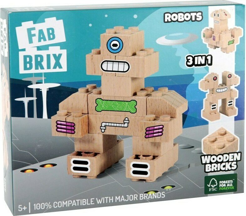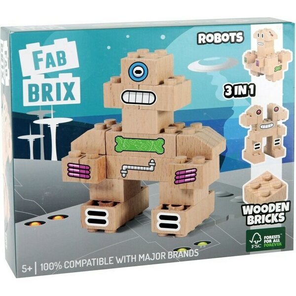 Rakenna ohjeiden mukaan erilaisia robotteja tai luo palikoista ihan muuta. Vain mielikuvitus on rajana! Paketissa on 14 erikokoista rakennuspalikkaa, kaksi erityistä kaksipuolista palikkaa ja tarra-arkki sekä ohjeet. Palikat on valmistettu puusta: jos ne joutuvat veteen tai jos ilmankosteus on korkea, ne saattavat muuttaa muotoaan. Älä kastele palikoita ja pidä ne poissa vedestä.