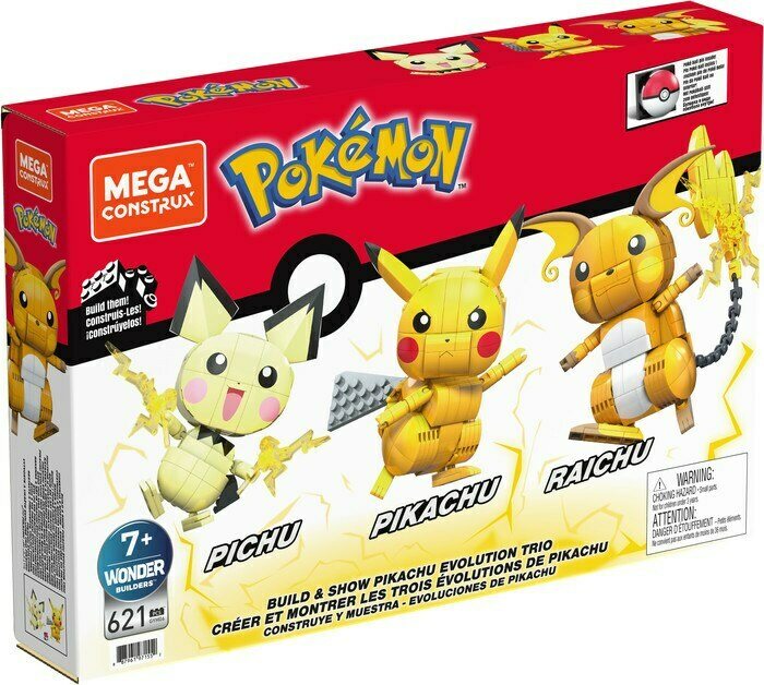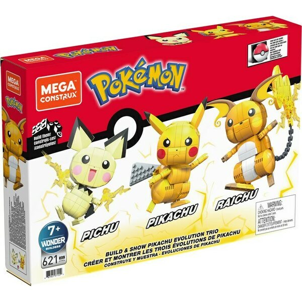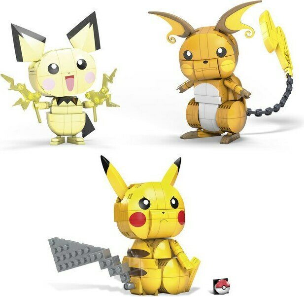 Rakenna itsellesi nämä kolme sähköistä Pokémonia ja taistelu voi alkaa! Setti sisältää Pichun kaikki kolme kehitysmuotoa: Pichun, Pikachun ja Raichun. Hahmojen korkeus 10 cm ja niillä on liikuteltavat nivelet. Yhteensä 621 palaa. Yli 7-vuotiaille.
