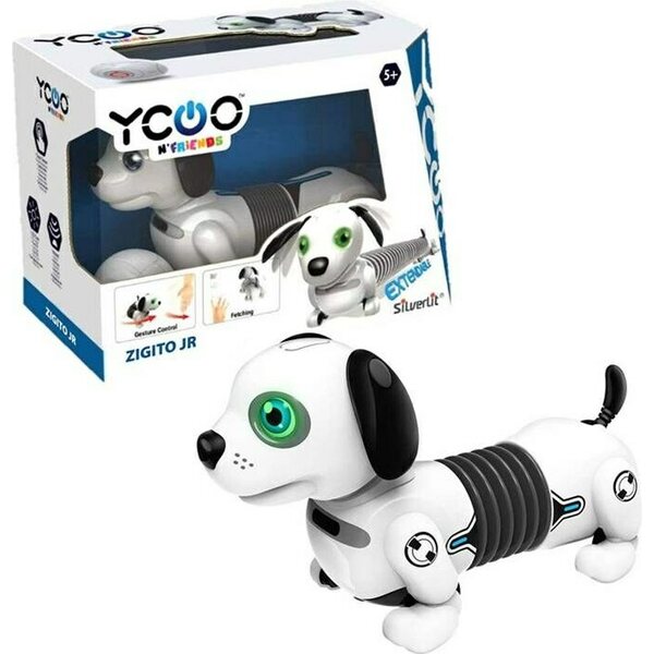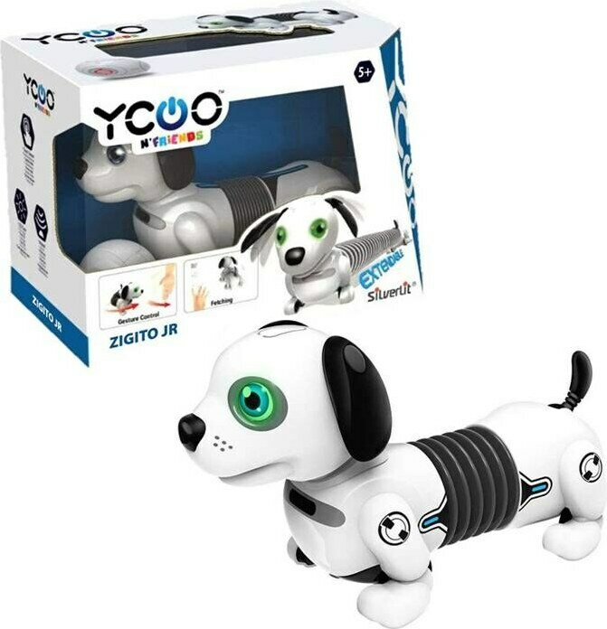 Interakriivinen roboottikoira. Ohjaa kädelläsi. Koira seuraa palloaan. Koira venyy jopa 70% suuremmaksi. Reagoi kosketukseen. Ikäsuositus 5+.
