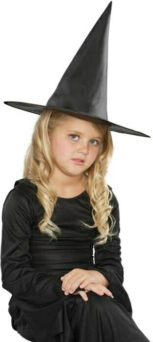 Lapsen päähän sopiva noidan hattu. Kuvasta poiketen hatun reunan kanttaus on vihreä tai oranssi, kokonaan mustaa hattua ei ole enää jäljellä.