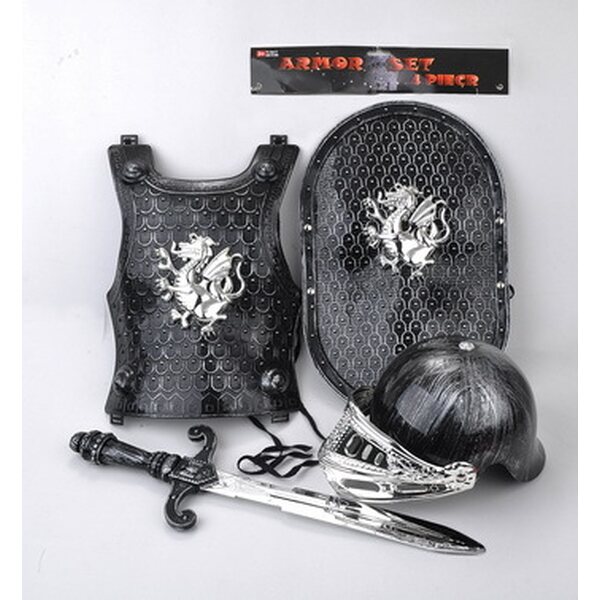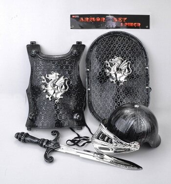 Ritarisetti, joka sisältää kilven, haarniskan, miekan ja kypärän.