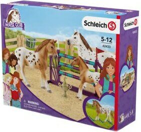 Pakkaus sisältää kaksi hevosta, yhden varsan, neljä aitapalaa, yhden esteen, sekä omenoita ja pokaalin. Ikäsuositus 4+