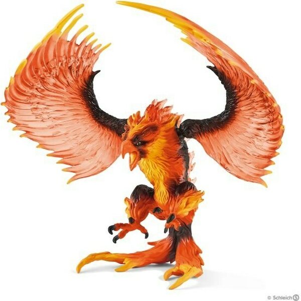Tuotteen kuvausSen valppaat silmät huomaavat kaiken: Korkealla laavamailman tulivuorten yläpuolella kaartelee Schleich® Eldrador® Creaturesin tulikotka majesteetillisesti ilmojen halki. Sen liikkuvat siivet varmistavat, että taidokkaalla linnulla on reilusti voimaa ja se hallitsee monimutkaiset lentoliikkeet vaivattomasti. Tulikotka havaitsee pienimmätkin liikkeet maassa ja jos kyse on tunkeilijasta, petolintu toimii nopeasti: Se levittää liikkuvat, läpikuultavat siipensä ja syöksyy kohti vihollista. Se vetää takanaan hehkuvaa liekkihäntäänsä, joka saa sen näyttämään putoavalta komeetalta. Tunkeutujille se ei tarkoitava vain kuumottavia korvia: Tulikotkalla on partaveitsenterävät kynnet, joilla se tarttuu kiinni armottomasti. Toinen ase, jota se käyttää hyökkäyksissään, on kaareva ja terävä nokka. Lopuksi tulikotka saa siivillään aikaan valtavan tulimyrskyn, joka vie vastustajan mennessään.