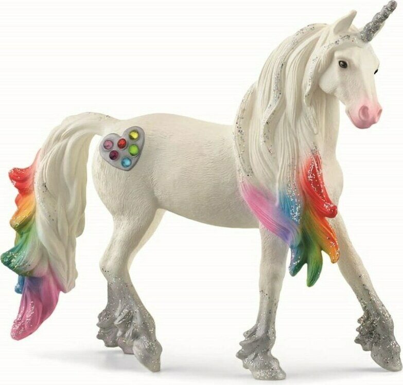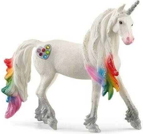 SCHLEICH 70725 SATEENKAARIYKSISARVINEN ORI. Valkoinen yksisarvinen ori hevonen, jonka harjassa ja hännässä sateenkaaren värit.