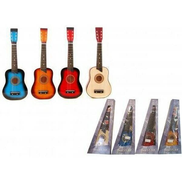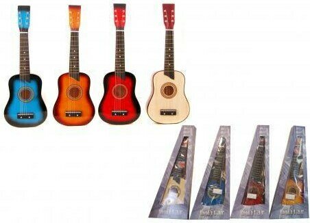 Vaihtoehtoina sininen, punainen, vaalean ruskea tai vaalea. Kitara on 65 cm pitkä. Pakkauksen mukana yksi plektra.