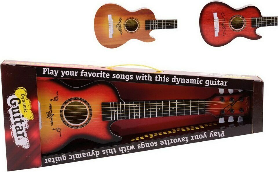 Soittoleikkeihin perinteinen akustinen kitara, jossa oikean kitaran tavoin 6 metallista kieltä. Kielet on kiristettäviä. Tuotteen mittatiedot: 60 x 25 x 7,6 cm – 0,659 kg.