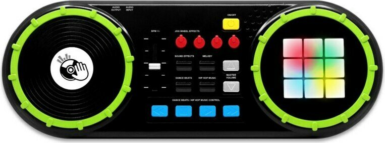 DJ mixeri paneeli, jossa pyörivä levysoitin, LED paneeli ja painikkeita. Sisältää erilaisia DJ efektejä ja rytmejä. 4+ vuotiaille