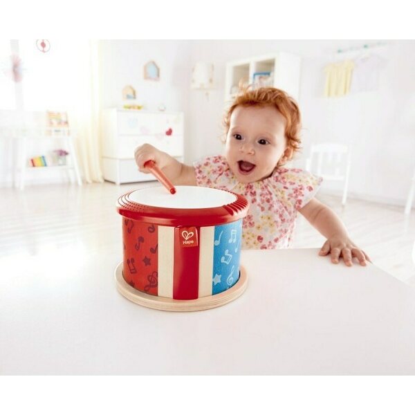 Värikäs kaksipuoleinen rumpu. Toinen rummutuspinta on puuta ja toinen on kumia. Mukana joustavasta muovista valmistettu soittokapula. Rummun Ø 17 cm. Paketin koko: 18x12x18 cm. Ikäsuositus: 1+.